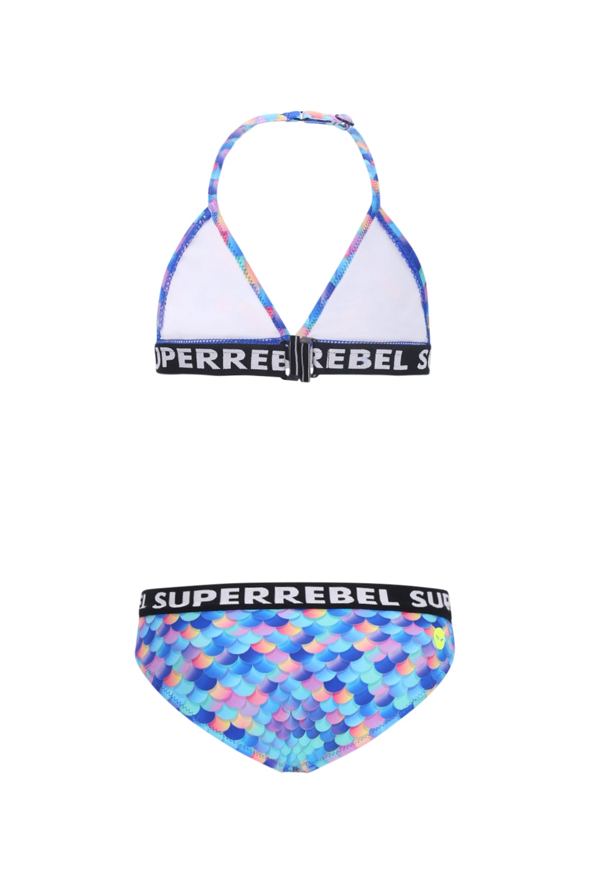 The Isla Triangle Bikini Mermaid Alloverprint Blue by SuperRebel is a must-have for every sporty girl. This bikini offers UPF 50+ sun protection and is fully lined. From size 152, a padded cup is added for extra comfort and support. The adjustable halter ensures a perfect fit, allowing every girl to move freely. Made from 85% recycled polyester, making it a sustainable choice for summer. Perfect for an active summer at the beach or by the pool.