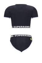 Crop Top Bikini Black van SuperRebel is een stoere keuze voor actieve girls. Deze volledig gevoerde croptop bikini met korte mouwen is gemaakt van 85% gerecycled polyester en biedt UPF 50+ zonbescherming. Perfect voor een zomerse outfit op het strand of aan het zwembad. Een sportief en gedurfd item voor kids die lef tonen.